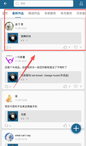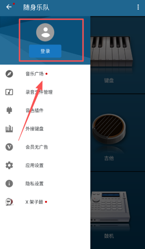 2、而通过右上角的横杠按钮,我们可以打开个人功能列表,从而点击进入“音乐广场”页面,查看其他用户上传的音乐作品。