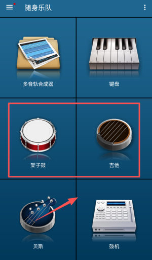 1、下载安装后打开随身乐队,可以直接通过首页的“多音轨合成器”,合成和调整手机里的音频文件,或者使用直接用手机来演奏录制“架子鼓”、“吉他”等乐器。
